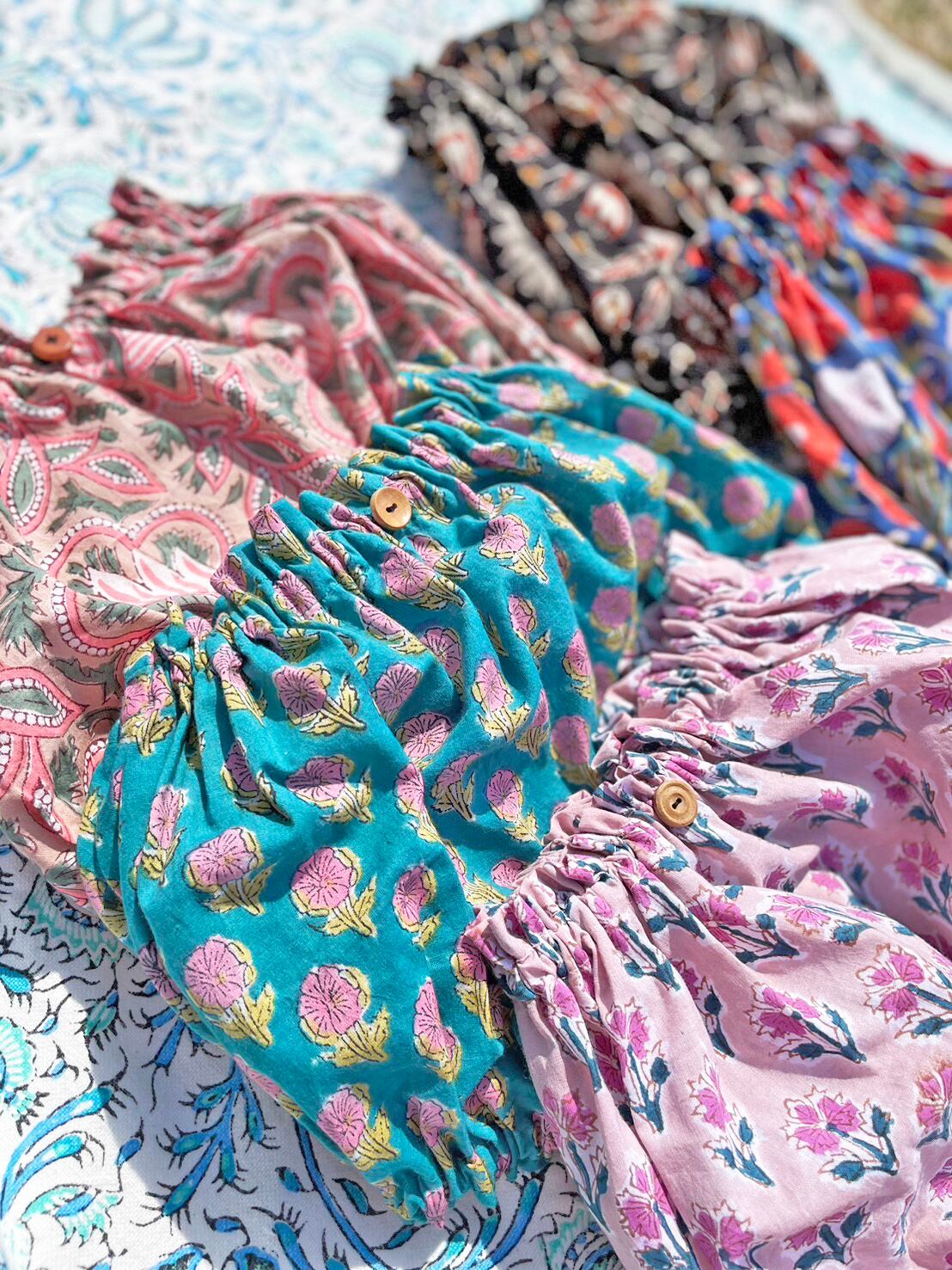 インドの伝統技法である、職人が木版を使い一つ一つ染色していくブロックプリントの生地を直輸入。